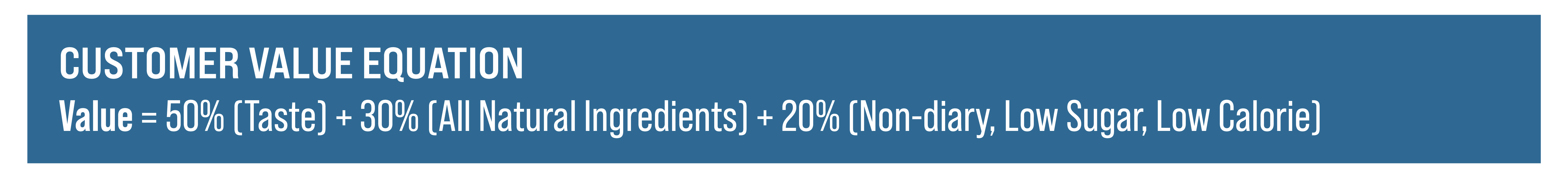 STEP 1 – Target Segment and Needs Identification. Almetta conducted focus groups and customer surveys to determine its target segment was over 90% female, 15-55 years old, college educated, and had an annual income over $75,000. These customers valued a healthy lifestyle, were typically lactose intolerant, and carefully read labels on anything they bought. Almetta next determined their customer value equation as shown in Figure 1.