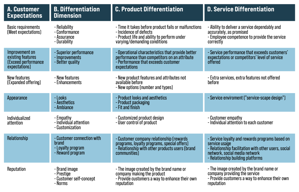 – Service-based differentiation is critical in today’s world. Many companies that offer very similar products differentiate themselves through superior service. Service-based differentiation taps into intangible benefits that can be more important than physical product features. As shown in Colum D of figure 1, service-based differentiation can take