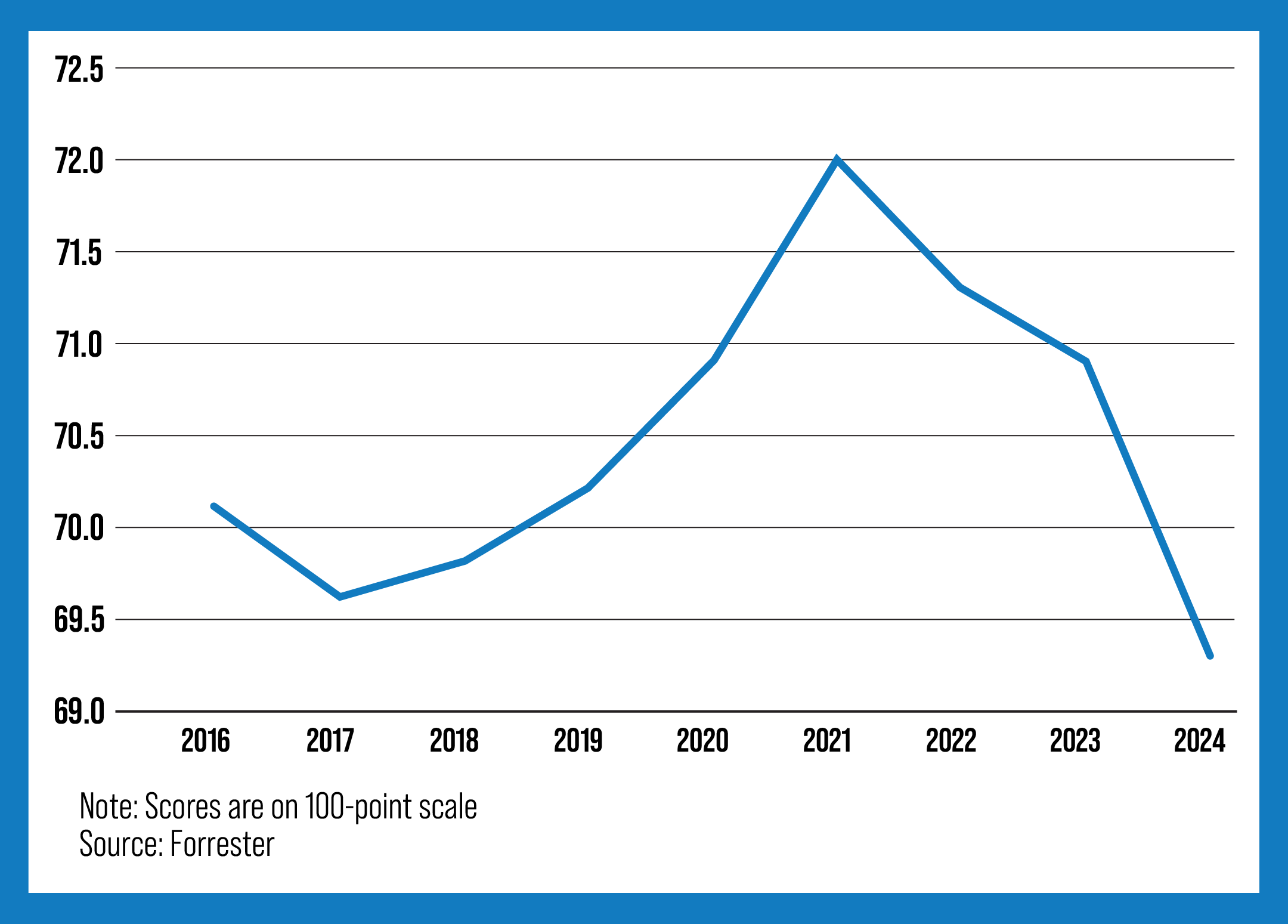 Since 2016, Forrester has surveyed nearly 100,000 consumers across 223 brands. The trend is shown below (reproduced from the Wall Street Journal, 2024). According to Forrester’s 2024 CX Index, the average customer experience score in the U.S. has decreased to 69.3 out of 100, its lowest since 2016.