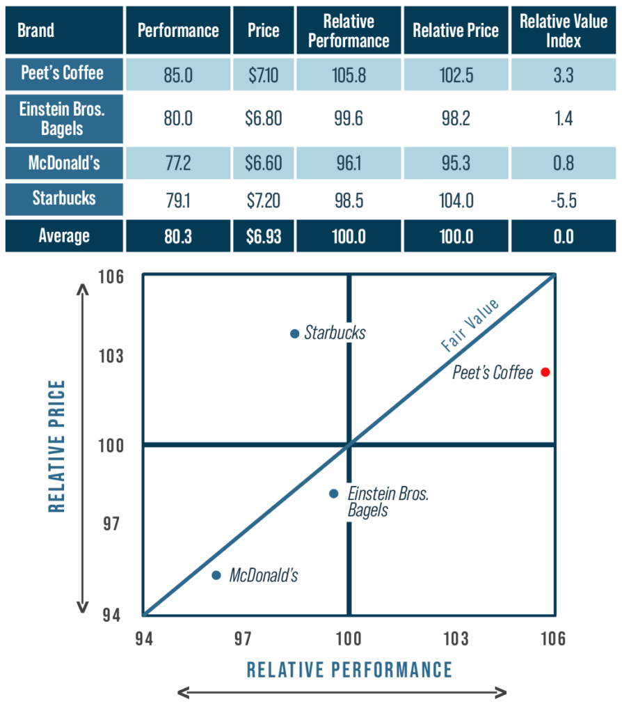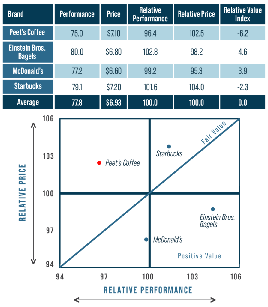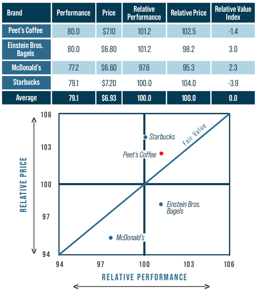 Instruction: Shown above is a Value Map for Peet’s Coffee, including current Performance (82) and Current Price ($7.10). Select any of the three Peet’s Coffee performance options (yellow cells) to see how Peet’s Coffee changes in Relative Performance, Relative Value Index and location in the Value Map.